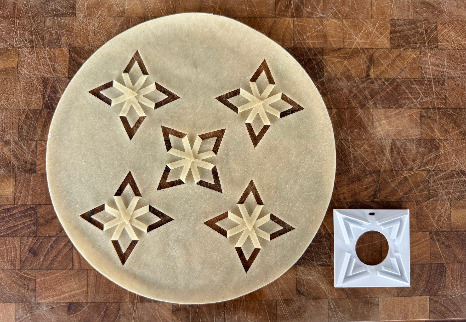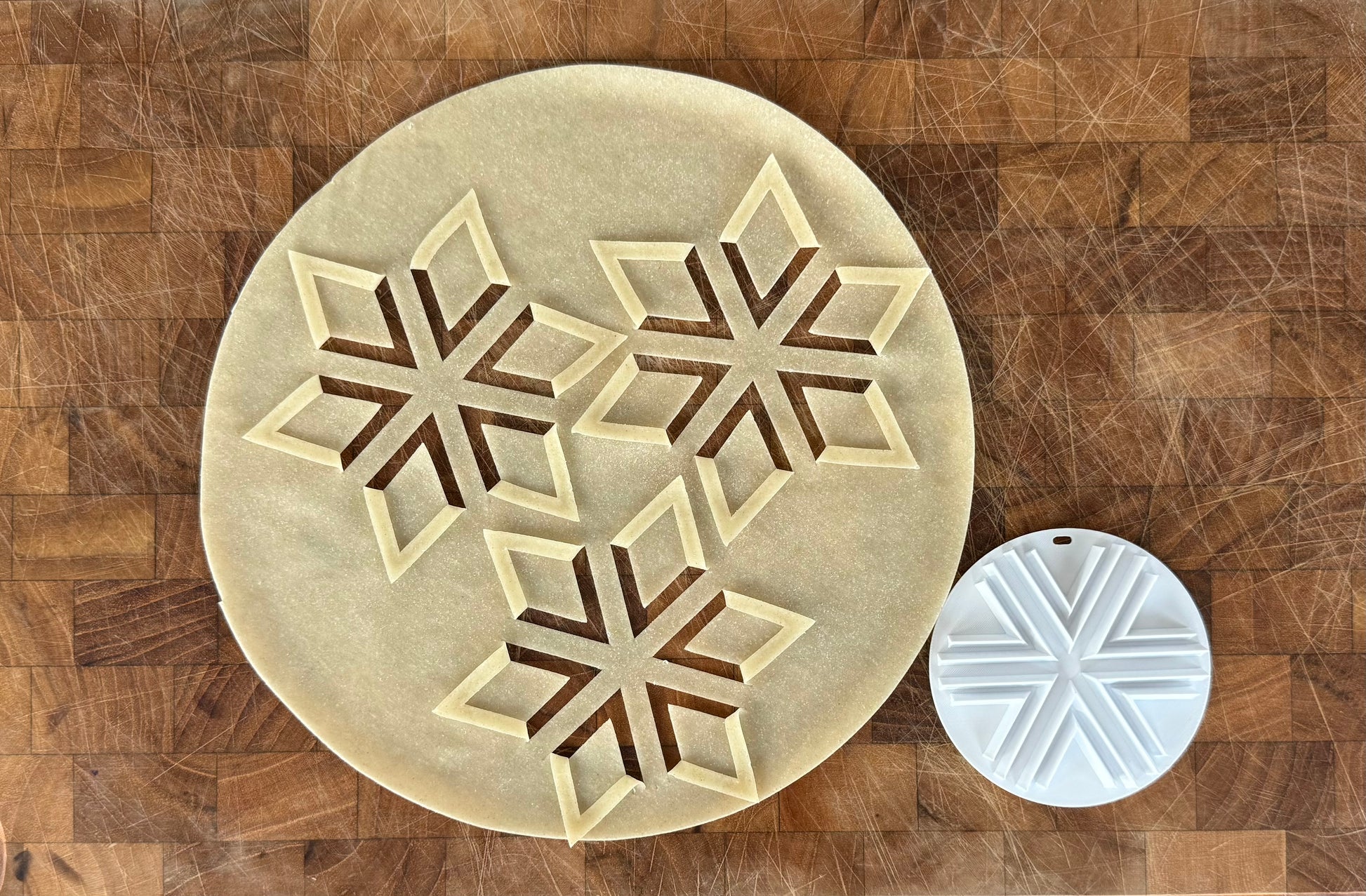 Mikilvægt er að þrýsta stimplunum þétt ofan í deigið svo að skurðurinn nái vel í gegn og fléttist fallega.